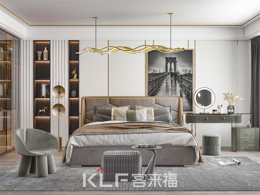 臥室采用不同于客廳書房的溫馨色調(diào),反而采用的現(xiàn)代金屬風(fēng)讓并無(wú)太多家居搭配的臥室,能夠?qū)⒑?jiǎn)約與奢華共聚一身,且相處融洽。