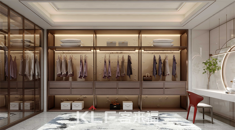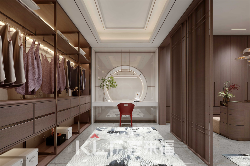新中式開(kāi)放式衣帽間,以屏風(fēng)分隔其他空間,打造出一塊相對(duì)的獨(dú)立區(qū)域。背板運(yùn)用皮雕工藝,鋁木型材框架搭配實(shí)木材質(zhì),布局主要存儲(chǔ)區(qū)。底部掏空,增強(qiáng)衣帽間的靈活性,中下部安裝推彈軌道抽屜,觸摸即可抽拉。